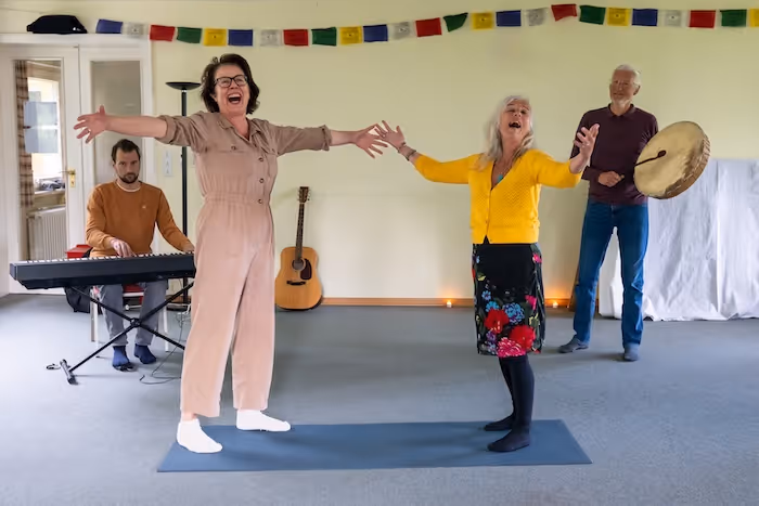 Ik weet inmiddels dat ik jou als jouw begeleider het vertrouwen kan geven dat er niet meer gebeurt dan jij aankan. Mede omdat ik meevoel als je dreigt te dissociëren. Steeds weer wijs ik dan op contact met je voeten en de grond. Zo zie je in onze workshops ook dat er soms voeten worden vastgehouden. Ook bereiden we het zingen voor met grondingsoefeningen als stampen, door je benen zakken en schoppen. Begeleid door (oer)klanken en sjamanendrums. VliegenDoor de veilige bedding en het aanwezig zijn in je lijf, kun jij je overgeven aan het zingen en de klanken die uit jou willen komen. Dat kan voelen als vliegen zo vrij.Als ik vol overgave sta te zingen met mijn armen wijd uitgespreid valt alle ruis weg en val ik samen met de klanken. Zoals ik een deelnemers laatst hoorde zeggen:"Het was niet ik meer die zong; de klanken zongen door mij heen."Dat kan een ervaring van eenheid zijn.